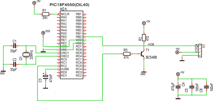 Die Schaltung zum Senden und Empfangen entspricht einer durch den Computerhersteller empfohlenen Konfiguration. Ein NPN-Transistor arbeitet als Open-Collector "Treiber" gegen einen 470 Ohm Pull-Up-Widerstand gegen +5V. Dieser wird vom CCP1-Modul des PIC angesteuert