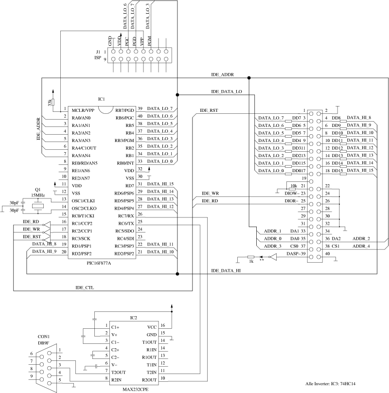 Ein Microcontroller der Firma Microchip des Types PIC16F877A eignet sich relativ gut als IDE-Controller, da viele I/O Pins und eine eingebaute UART.