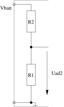 Um zu verhindern dass diese Schaltung eine evtl. ohnehin schon leere Bordbatterie weiter leert und damit das Starten verhindert bzw. den Notlauf bei defekter Lichtmaschine verkürzt ist eine Vorrichtung zum Tiefentladeschutz vorgesehen. Dieser wird über einen weitern A/D-Kanal (AN2) des PIC implementiert und besitzt eine programmierte Hysterese um ein Flattern bei Betriebsspannungen gerade am Grenzwert zu unterdrücken. Hierzu wird die Batteriespannung direkt am Eingang abgegriffen und über einen Spannungsteiler mit dem Faktor 1:4,9 heruntergeteilt.