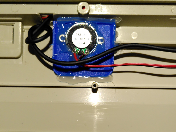Der Lautsprecher wurde mit einer kleinen Adapterplatte und viel Heißkleber im Gehäuse fixiert. Jetzt hat die Tastatur angeblich 2W Musikleistung.
