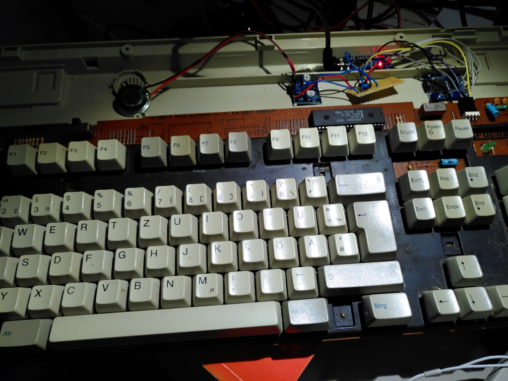 Eine (sehr) alte Tastatur (Baujahr ca. 1988), bringt das Gehäuse und "User-Interface" mit. Ein Arduino Nano ist mit dem original-Tastaturcontroller verbunden und nimmt die Eingaben entgegen.