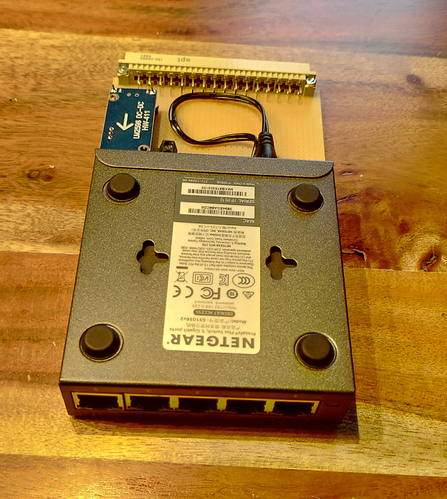 The Netgear GS105x series fits exactly on breadboards with male connectors. Even a LM2596 including circuitry fits on the board without any problems, so that modular network infrastructure can be built.