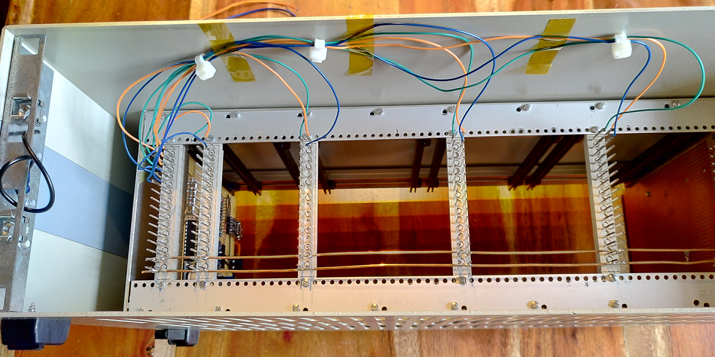 The power supply is wired using 1,5mm^2 rigid wire from the from the house installation. It had beens staightened and laid between the individual contacts. This is simply soldered to the pins of the female connector. So the female connectors can be mounted with only four soldering joints and can be moved relatively easily over the entire width of the subrack.